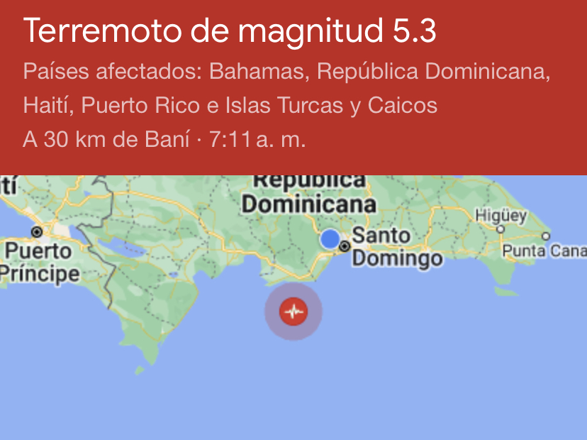 Internacionales Nacionales Fuerte sismo sacude la República Dominicana febrero 1, 2023 Periodismo Sociedad 0 comentarios Hoy se registró un terremoto de magnitud 5.3 en República Dominicana. Otros países afectados fueron Bahamas, Haití, Puerto Rico e Islas Turcas y Caicos. El epicentro se produjo a 30 km de Baní, a las 7:11 de la mañana de este miércoles.