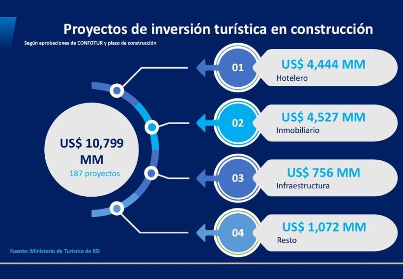 Santiago, RD. Las inversiones en construcciones turísticas en la República Dominicana ascienden a 10,799 millones de dólares y el renglón inmobiliario lidera la lista de esos proyectos.
