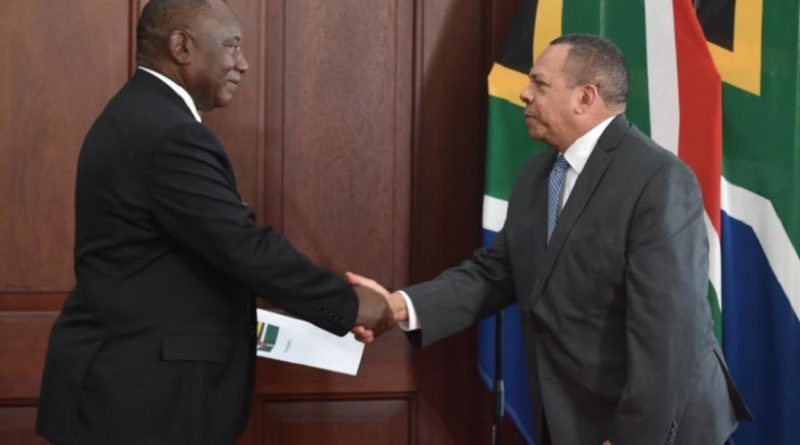 Pretoria. Sudáfrica. El embajador de República Dominicana, licenciado Héctor Galván, presentó el pasado miércoles 15 de mayo, sus cartas credenciales por ante el recién juramentado presidente de Sudáfrica, Señor. Cyril Ramaphosa.